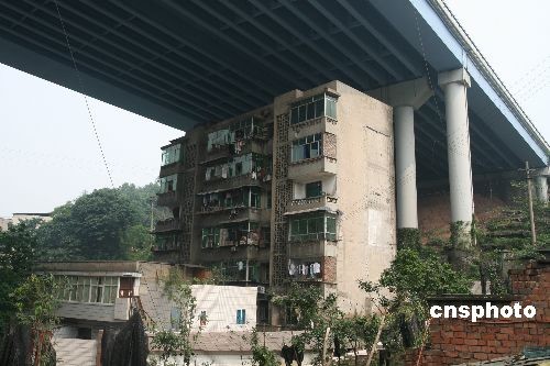 圖為重慶渝黔高速路南山立交橋下的一幢6層居民樓,此樓樓頂立交橋,背倚橋柱,在網上被稱為“終年曬不到太陽、淋不到雨的最牛的樓房”。而近日這棟“最牛樓房”還未拆遷,旁邊卻又要開建新房,引起了廣大市民的熱議。中新社發 孫須 攝