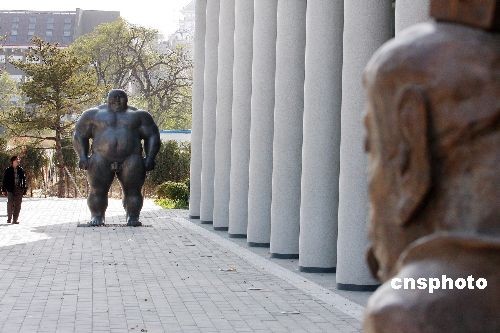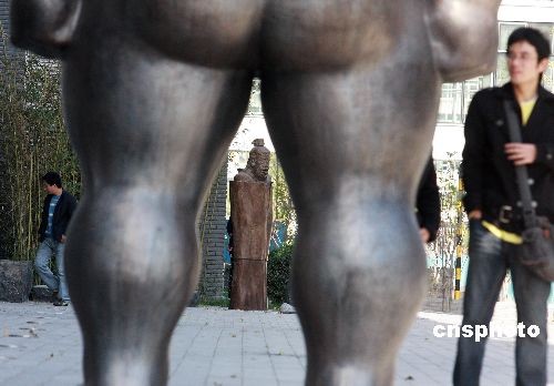 11月2日,北京大學(xué)光華管理學(xué)院新樓門前,中央美術(shù)學(xué)院雕塑系兩位老師申紅飆于2008年創(chuàng)作的《蒙古漢——站》,田世新于2003年創(chuàng)作的《剛?cè)嶂馈献酉瘛罚^往行人的目光。這兩尊雕塑,一尊是逾3米高、露生殖器的壯漢,一尊則是張嘴露齒的老子雕像,它們相對(duì)而立,近日引發(fā)爭(zhēng)議。中新社發(fā) 鄭雄增 攝