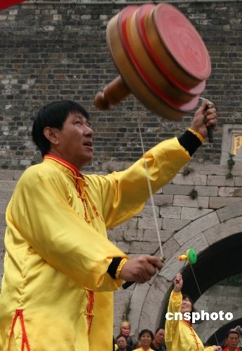 11月6日,在南京中華門城堡廣場舉行的2008中國南京第二屆民間藝術節廣場活動上,由南京市空竹協會數十位空竹愛好者展示的空竹絕技,吸引了眾多市民和游客。中新社發 鐘山 攝