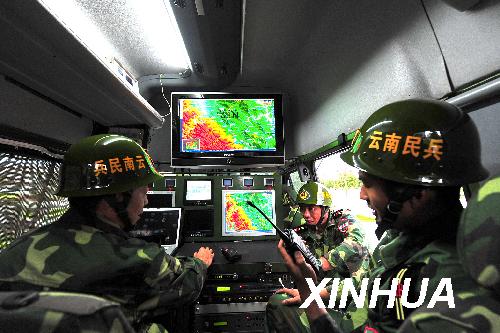 在云南楚雄等地發生滑坡泥石流災害后,云南民兵預備役應急通信分隊派出安裝著地理信息、GPS定位、衛星圖像傳輸、微波無線通信等車載工作系統組合的移動指揮車及數輛前方信息偵察車,用科技手段為救災工作提供精確信息和清晰圖像。新華社記者 陳海寧 攝