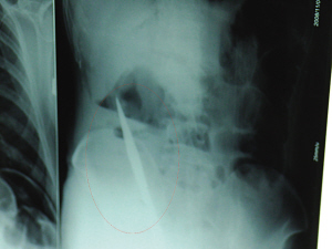 6日上午,記者在徐州礦務集團總醫院重癥監護室見到了這名男子,目前他雖然已經恢復了意識,但還不能開口說話,需要呼吸機輔助呼吸。據醫生介紹,4日中午12時左右,這名男子因服毒輕生被緊急送到醫院進行搶救,之前,這名男子已經在當地鄉鎮醫院進行了近20小時的治療,但效果不佳!安∪吮晦D院到礦總院時已神志不清,血壓極低,處于休克狀態!本茸o人員給男子洗胃、初步處理以后,發現男子呼吸急促,于是趕緊給他拍片檢查。結果讓所有的醫生大吃一驚,竟有一把尖狀異物橫在該男子腹腔內!當天下午5時30分,輕生男子被推上了手術臺。經過40多分鐘的手術,該男子腹腔被打開,手術醫生發現,男子體內的金屬狀異物竟然是一把長19厘米的尖刀!