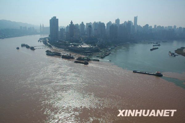 11月8日,受長江上游持續降雨和三峽工程實驗性高位蓄水影響,重慶朝天門港的嘉陵江、長江交匯處江水呈現一清一渾,涇渭分明。據了解,往年入冬時節長江、嘉陵江已進入枯水期,今年隨著三峽水庫蓄水,長江水位迅速上升,當日18時,重慶寸灘長江水位達到175.32米。 新華社發(周會 攝)
