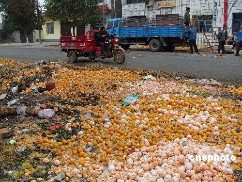 2008年11月10日,湖北宜昌市夷陵區(qū)鴉鵲嶺鎮(zhèn),被當(dāng)成垃圾傾倒在路邊的柑橘隨處可見。據(jù)悉,受四川廣元“蛆柑”事件影響,沒有出現(xiàn)疫情的湖北省柑橘外銷曾一度全面停滯,經(jīng)有關(guān)有關(guān)部門“救市”后,目前銷售量已恢復(fù)到正常水平的85%,但柑橘收購價較往年暴跌,而且收購商對柑橘的大小、品相等要求嚴格,導(dǎo)致大量“等外品”柑橘被當(dāng)成垃圾倒掉,經(jīng)濟損失慘重,成為橘農(nóng)們的錐心之痛。中新社發(fā) 劉君鳳 攝