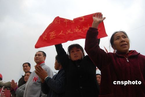 11月10日上午,在北茂公路擂禹段戰(zhàn)斗了180天的第二炮兵某工程團(tuán)撤離災(zāi)區(qū),踏上歸途,綿陽(yáng)各界群眾到公路沿線為官兵們送行。據(jù)四川省軍區(qū)參謀長(zhǎng)張培敏少將介紹,這支部隊(duì)是迄今為止,堅(jiān)守四川災(zāi)區(qū)時(shí)間最長(zhǎng)的一支救災(zāi)部隊(duì),也是最后一支撤離的解放軍部隊(duì)。中新社發(fā) 胥輝 攝