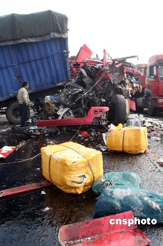 11月14日6時(shí)30分,由于受團(tuán)霧影響,滬昆高速江西東鄉(xiāng)縣195KM--196KM處往南昌方向同時(shí)間發(fā)生5起汽車(chē)追尾事故,造成16輛貨車(chē)追尾,高速公路交通一度受阻。據(jù)了解,事故已造成5人死亡、10人受傷。經(jīng)過(guò)當(dāng)?shù)赜嘘P(guān)部門(mén)全力搶救,到上午10時(shí),滬昆高速公路事故路段實(shí)行交通疏導(dǎo)分流,恢復(fù)部分交通,目前事故還在進(jìn)一步清理調(diào)查中。中新社發(fā) 何江華 攝