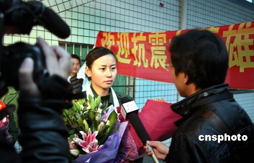 11月26日晨,武警某部貴陽籍女警花徐一蝶和楊帆退伍還鄉,乘火車從成都回到貴陽。親朋好友、同學和慕名而來的人群捧著鮮花在月臺迎接這兩位在汶川大地震中做出突出貢獻,立功受獎,并受到溫家寶總理接見的女警花。今年5月14日,徐一蝶和楊帆在救災過程中表現突出,被分別授予二等功和三等功1次。中新社發 彭年 攝
