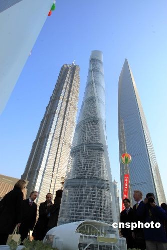 11月29日,中國第一高樓——“上海中心”在上海陸家嘴金融貿(mào)易區(qū)腹地開工,該超高層建筑總高度將達(dá)632米,將與毗鄰的超高層建筑“金茂大廈”、“環(huán)球金融中心”,形成“三足鼎立”美景,圖為開工儀式上,中外嘉賓搶先觀賞這一“上海新景觀”。據(jù)介紹,“上海中心”總投資額預(yù)估高達(dá)148億元人民幣,外觀螺旋造型象征中國和諧的文化精神。預(yù)計2012年結(jié)構(gòu)封頂且部分投入運營,2014年竣工交付使用。中新社發(fā) 潘索菲 攝