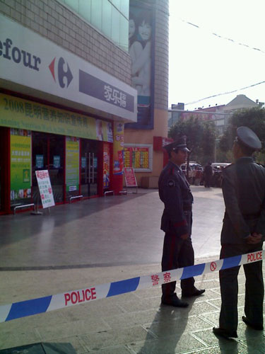29日上午,云南省昆明市龍泉路家樂福超市發(fā)生人質劫持事件,3名市民被歹徒刺傷,1人被劫持。經多方談判未果,為保護人質,警方開槍擊斃歹徒。