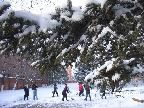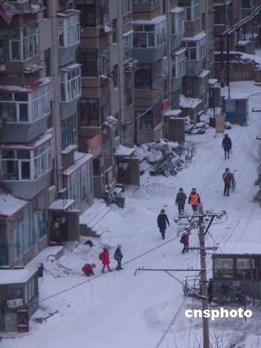 2008年12月4日,齊齊哈爾市再次降雪,城市銀裝素裹。當地氣象臺發布藍色寒潮預警信號,提醒市民做好預防寒潮準備。齊齊哈爾市已經連續兩天降雪,降雪給城市交通帶來了不便,車輛紛紛緩行,市民忙著清掃道路上的積雪。中新社發 王云龍 攝