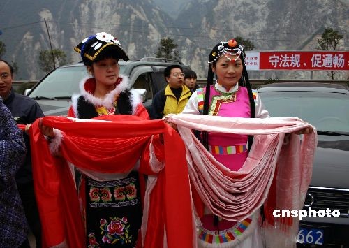 圖為映秀羌藏少女盛裝向海峽兩岸紅十字組織代表獻(xiàn)哈達(dá)。