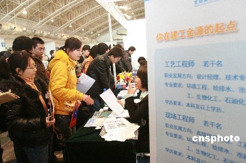 12月14日,2009年北京地區畢業研究生專場供需見面、雙向選擇招聘會在中國國際展覽中心舉辦,本次招聘會有700余家單位參會,提供14228個崗位,其中碩士學歷需求人數占總需求人數的92.4%,博士學歷需求人數占總需求人數的7.6%。據介紹,當日參加招聘會的研究生免費入場,僅上午已經有兩萬多名研究生前來應聘。中新社發 陳曉根 攝