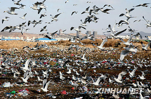 12月22日,成群海鷗在遼寧省大連市毗鄰海岸的一處垃圾場上覓食。連日來,受寒潮襲擊,大連市氣溫急劇下降近10攝氏度,致使渤海灣金州西海岸近海灘涂大面積結冰。生活在這里的海鷗突遇“糧荒”,不得已選擇毗鄰海岸的城市垃圾場覓食。新華社發(徐德武 攝)