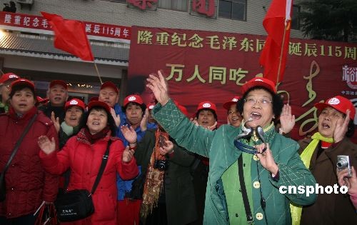 12月26日,一支來自北京的旅游團(tuán)隊(duì)在毛澤東家鄉(xiāng)韶山村高歌《東方紅》。當(dāng)天是毛澤東誕辰115周年,人們以這種方式抒發(fā)對毛主席的敬仰和懷念之情。中新社發(fā) 鄧霞 攝