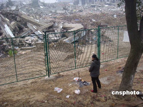 2009年元旦節,四川大地震極重災區的北川縣曲山鎮一位母親,清晨到北川中學地震遺址上香,悼念在此失去生命的兒子。中新社發 賈國榮 攝