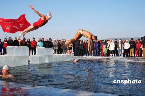 2009年1月1日,遼寧省沈陽市歡度新年暨全國“冬泳日”冬泳表演在棋盤山冰雪大世界秀湖舉行。150多名冬泳愛好者進行了“天鵝湖”表演及跳水表演。中新社發 劉寶成 攝