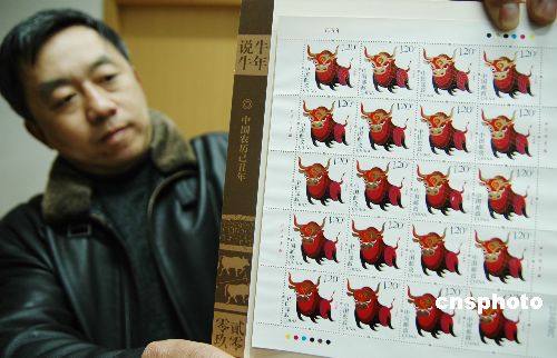 2009年1月4日,即將發(fā)行的《己丑年》特種郵票運(yùn)抵蘇州。據(jù)悉,國(guó)家郵政局和中國(guó)郵政集團(tuán)公司將于1月5日在蘇州首發(fā)該套以“奔牛”為形象的《己丑年》特種郵票。該次發(fā)行的《己丑年》郵票一套一枚,面值1.2元。郵票圖案為健壯倔強(qiáng)的奔牛形象,表現(xiàn)出奮力向前的視覺(jué)效果,寓意人們對(duì)生肖牛年的期望與寄托。中新社發(fā) 朱子寒 攝