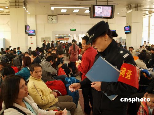 1月4日消息,廣州鐵路公安在對(duì)乘客的車票進(jìn)行檢查。廣州鐵路采取了一系列有力措施,大力凈化旅客的購(gòu)票環(huán)境和乘車秩序,防止票販從中得利,侵犯旅客和農(nóng)民工權(quán)益,保障旅客乘車安全。中新社發(fā) 金槍花 攝