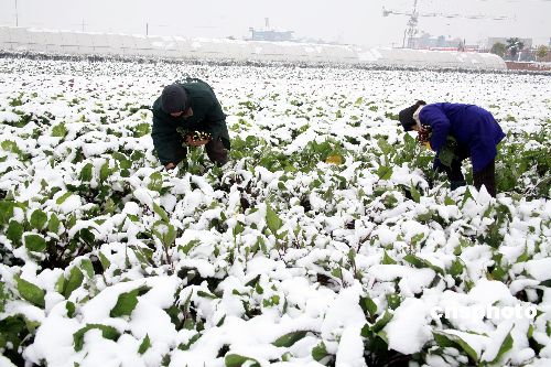 1月6日,湖北省枝江市市民正在采摘蔬菜。據氣象部門發布的信息表明,5日至6日,湖北省的西部地區普降中雪,省政府辦公廳已下發緊急通知,要求各市、州、縣人民政府,省政府有關部門認真做好應對低溫凍害工作。中新社發 柳月 攝