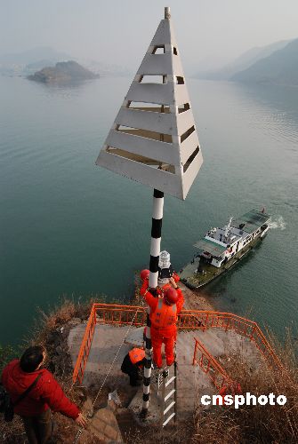 2009年1月8日,在三峽重慶庫區云陽段,航道管理人員在安裝新型太陽能航標燈。這種航標燈集太陽能光板、蓄電池、燈具于一體,視距更長、靈敏度更高、耐用性更好,可有效解決三峽庫區江面增寬和霧氣較大給船舶航行帶來的影響。目前,三峽庫區航道管理部門正在陸續更換,僅云陽縣就有30只新型太陽能航標燈在春運期間投入使用。中新社發 劉小洋 攝