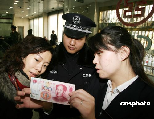 1月10日,北京110迎來第十三個宣傳日。北京崇文區警方向市民講解識別假幣的知識。中新社發 胡建強 攝