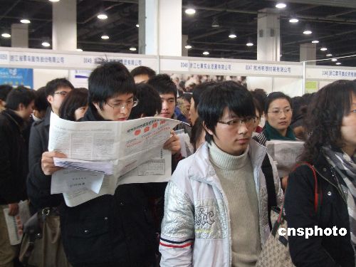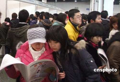 1月13日,浙江杭州舉辦了2009屆高校畢業生就業招聘大會,幾乎每個單位的攤位前都排起了應聘長龍,大多數學生為了投遞一份簡歷,需要排上1個多小時的隊。中新社發 趙曄嬌 攝