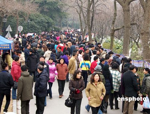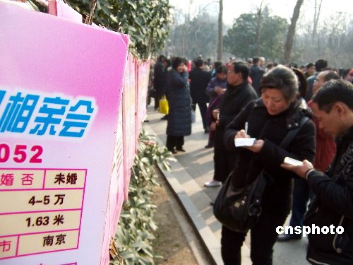 2009年1月17日,江蘇省南京市2009年首場(chǎng)萬(wàn)人相親會(huì)在該市莫愁湖公園舉行。此次相親會(huì)打出了溫情標(biāo)語(yǔ)“我想有個(gè)家”,吸引了當(dāng)?shù)乇姸嗾骰檎呒捌溆H友參加。中新社發(fā) 王啟明 攝