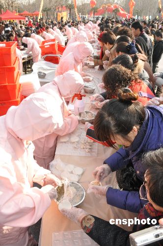 1月18日是農(nóng)歷新春小年,鄭州市“2009歡樂購物過大年”活動(dòng)在綠城廣場(chǎng)舉行,2009人在鄭州市綠城廣場(chǎng)一同包餃子并現(xiàn)場(chǎng)制作品嘗。中新社發(fā) 劉書亭 攝