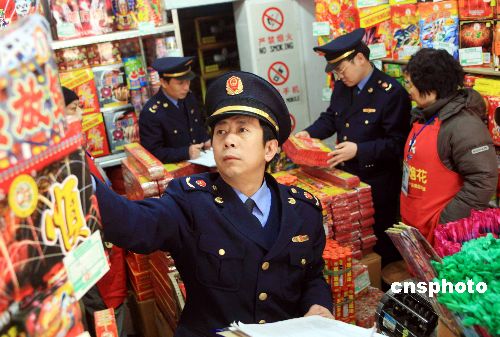 一月十九日,是北京2009年春節(jié)銷(xiāo)售煙花爆竹的首日,為保障市民安全歡度新春佳節(jié),西城工商執(zhí)法檢查人員對(duì)首日開(kāi)始銷(xiāo)售的市場(chǎng)進(jìn)行檢查。中新社發(fā) 任海霞 攝