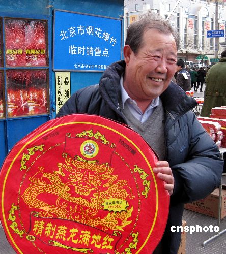 2009年1月20日,在京城馬連道煙花爆竹銷售網(wǎng)點,人們在購買煙花爆竹。今年北京五環(huán)內(nèi)614家臨時銷售網(wǎng)點向市民供應煙花爆竹,花炮品種比2008年多了不少,而且價格也降低了10%左右,還增加了奧運系列產(chǎn)品。中新社發(fā) 馬毅行 攝
