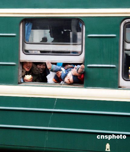 1月21日,在江蘇丹陽(yáng)火車(chē)站,一輛列車(chē)停靠在站臺(tái)上,一位母親將兒子抱出窗外小便,場(chǎng)景既有趣又讓人感到不安。中新社發(fā) 封波 攝