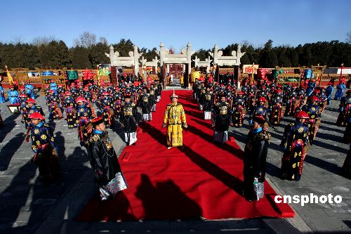 1月26日農(nóng)歷正月初一,第24屆地壇春節(jié)文化廟會(huì)如期舉行,廟會(huì)歷時(shí)8天,至2月1日截止。每年地壇廟會(huì),地壇公園芳澤壇都會(huì)舉行場(chǎng)面宏大的仿清祭地表演,“皇帝”帶領(lǐng)文武百官、侍衛(wèi)儀仗等200余人身著盛裝祭祀,祈求地神保佑、國(guó)泰民安、風(fēng)調(diào)雨順、五谷豐登,今年的祭地表演則因?yàn)椤安莞实邸钡暮_x而備受關(guān)注。從普通市民中遴選出來(lái)的“草根皇帝”李少華正式上任,迎神送神、三叩九拜,在數(shù)百游園觀眾的注視下,黃袍加身的李少華邁著堅(jiān)定的步伐,完成了一次皇家禮儀文明之旅。中新社發(fā) 富田 攝