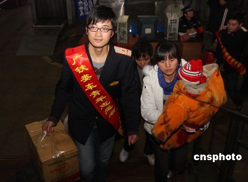 1月29日,湖南省婁底車務(wù)段的青年志愿者在婁底火車站為攜帶許多行李等老弱病殘等旅客提供各種幫助。當(dāng)日,湖南省婁底火車站迎來節(jié)后返程客流小高峰,婁底車務(wù)段團(tuán)委組織近千名團(tuán)員青年志愿者開展“和諧春運”活動,在管區(qū)內(nèi)的車站設(shè)立了被旅客稱為“愛心島”的青年志愿者服務(wù)站,為旅客提供溫馨服務(wù)。中新社發(fā) 郭國權(quán) 攝