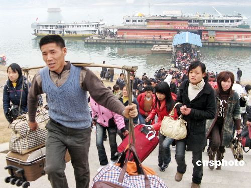 1月30日,10余艘出川客輪穿過三峽兩壩靠泊在湖北宜昌港,僅大公橋碼頭就有數千農民工上岸分流,三峽春運節后首波高峰如期而至。據了解,三峽農的民工有逢陰歷雙日出門的習俗,因而高峰客流將兩天出現一次,一直持續到春運結束。中新社發 韓玉洪 攝