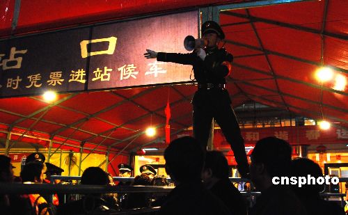 春節(jié)假期接近尾聲,中國(guó)鐵路迎來(lái)返程農(nóng)民工客流高峰。圖為1月30日晚大批農(nóng)民工正在南昌鐵路局九江火車站準(zhǔn)備上車,一名鐵路警察正站在高處指揮乘客有序進(jìn)站。中新社發(fā) 胡國(guó)林 攝