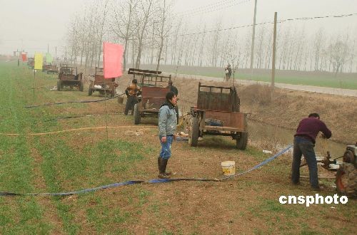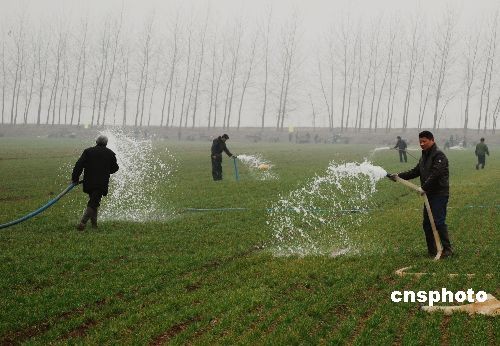 2月8日,安徽省鳳陽縣府城鎮顧臺村的村民在田間抗旱保苗。由于青壯勞力外出務工,當地許多家庭勞力缺乏,面對歷史上罕見的嚴重旱情、小麥逐漸枯黃而一籌莫展。當地政府發動村民組織“互幫互助隊”,幫助一些老弱病殘家庭的農戶。中新社發 馬順龍 攝