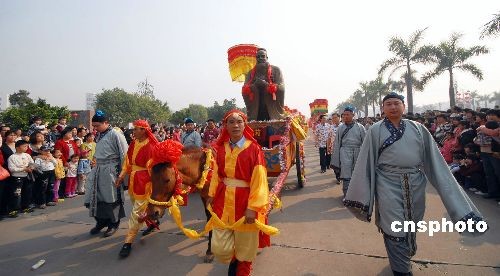 2月9日,廣東德慶依古制進行公祭、民祭儀式,萬人肅穆,向孔子圣像朝拜,為該縣鬧元宵活動添上濃厚的儒家文化韻味。中新社發 談細育 攝