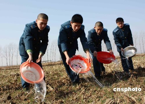 2月10日,官兵正在幫助駐地群眾澆灌麥苗抗旱。連日來,濟南空軍某飛行學院官兵在全力以赴協助地方政府搞好人工增雨工作的同時,成立了多支抗旱救災黨員突擊小分隊,千余名官兵深入到駐地農村田間地頭幫助群眾安裝水泵、疏通渠道、澆灌引水,支援地方抗旱保苗,最大限度地減少旱災造成的損失。中新社發 耿國慶 攝