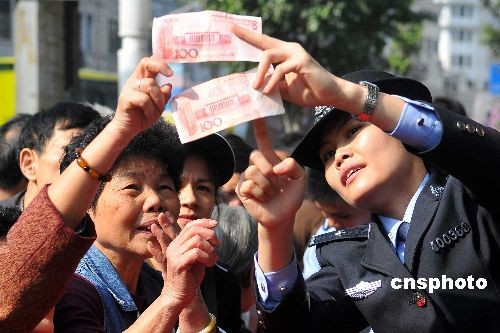 2月12日,廣西梧州市金融、公安、工商部門聯合在市區開展反假幣宣傳活動,專家們一一為市民群眾揭開真、假鈔票的區別,教授辨別真、假鈔票的技巧。中新社發 何鎏 攝
