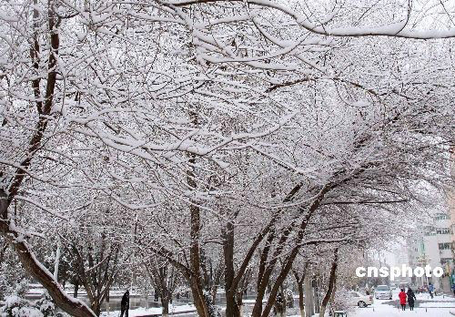 2月13日,新疆哈密地區出現降雪降溫天氣,哈密市街頭的樹木上掛滿了白雪,形成了美麗的雪凇景象。據了解,地處盆地的哈密市在春天出現雪凇現象十分少見。中新社發 蔡增樂 攝