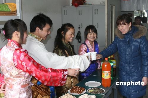 2月24日,中國藏歷年三十,在天津紅光中學就讀的藏族學生穿起民族服裝,與老師、同學一起迎接藏歷新年。天津紅光中學是天津唯一一所藏漢共讀的民族教育學校,截至目前,已有3500余名藏族學生從這所學校初、高中畢業,其中1600余人考入大專院校深造。中新社發 郭曉帆 攝