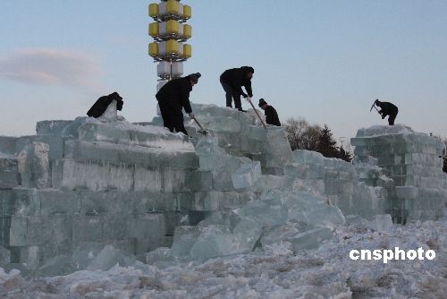 2月28日,施工人員在牡丹江市城區冰堡旅游景點拆除融化的冰雕作品。“立春”過后,素有“雪城”之稱的黑龍江省牡丹江市氣溫回升較快,城區內的各大冰雪旅游景點的冰雪作品開始融化,失去寒冬里的風采。從當日起,城區冰雪旅游景點管理部門對融化的冰雕作品進行拆除。中新社發 莊文斌 攝