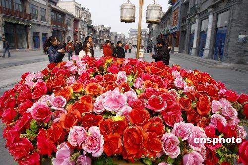 3月3日,隨著“三八”婦女節的臨近,北京前門大街用多彩的“絹花玫瑰”來裝扮街景,市民和游客提前感受到濃濃的節日氣氛。中新社發 鄭雄增 攝