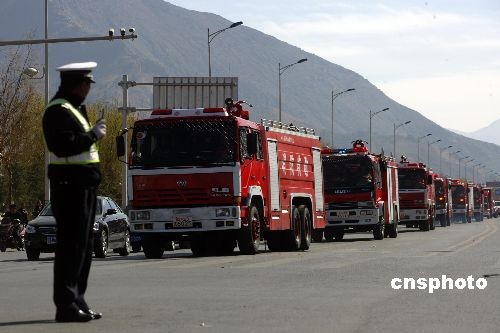 3月10日,西藏公安消防部隊特種裝備車輛亮相拉薩街頭,26輛特種消防車輛在市區的主要街道進行拉動演練。中新社發 劉震 攝
