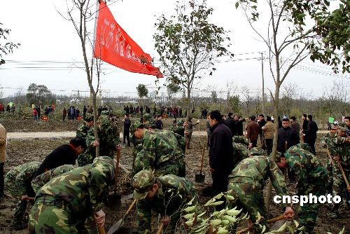 3月11日上午,植樹節即將到來之際, 江蘇省揚州市開展全民義務植樹活動。江蘇某預備役高炮師組織官兵到駐地參加義務植樹。圖為官兵在同當地市民共同種下白玉蘭樹。中新社發 田亞威 攝