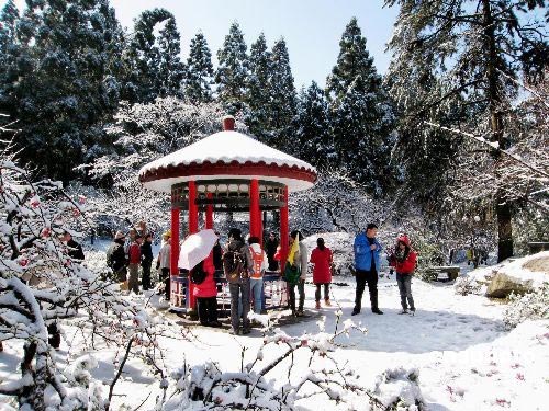 受冷空氣影響,江西廬山喜降春雪,把廬山裝扮得分外妖嬈,大批中外游客紛至沓來。圖為三月十四日拍攝的江西廬山小天池諾娜塔的雪景。中新社發 李忠東 攝