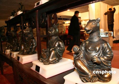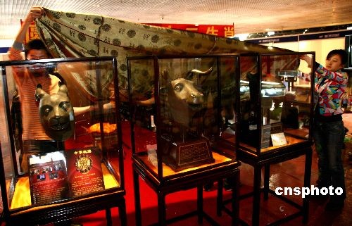 3月18日,圓明園獸首在第七屆全國工藝品、旅游品、禮品博覽會上亮相。當日,第七屆全國工藝品、旅游品、禮品博覽會在大連星海會展中心展出,圓明園十二生肖獸首精仿品亮相。這次展出的獸首分全套縮小比例展品部分和全套人身獸首縮小比例部分,其中,牛首、兔首和鼠首均是按照實物1:1比例設計制作的。中新社發 徐德武 攝