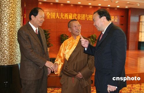 正在美國訪問的中國全國人大西藏代表團18日與紐約當地僑學界舉行座談,相互交流。圖為代表團團長、全國人大代表、西藏自治區人大常委會副主任新雜·單增曲扎活佛(中)與紐約當地僑領親切交談。中新社發 魏晞 攝
