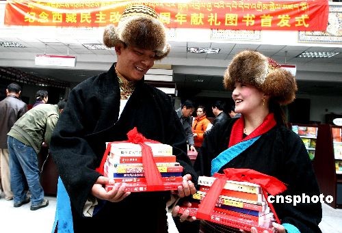 3月25日,紀念西藏民主改革50周年獻禮圖書首發式在拉薩舉行。藏漢文版大型畫冊《西藏今昔》、全彩版圖書《雪域邊線行》、藏文版《西藏民主改革50年》等圖書在具有歷史重大意義的時候為讀者獻上一份厚禮。中新社發 杜洋 攝