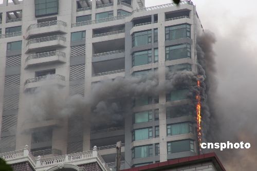 二十六日上午十一時,廣州市濱江東路中山大學(xué)牌坊文化廣場旁一高層住宅樓發(fā)生火警,火勢從大樓外墻電線一直向樓頂蔓延,幸有消防員及時撲救,事故中無人員傷亡。中新社發(fā) 羅仰明 攝