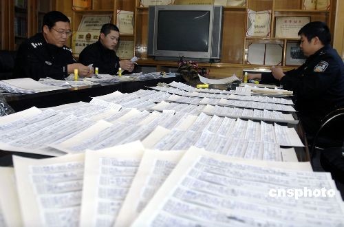 北京豐臺(tái)警方經(jīng)縝密偵查,近日一舉將一個(gè)用電話進(jìn)行詐騙的特大犯罪團(tuán)伙打掉,15名嫌犯全部落網(wǎng)。警員正在整理該團(tuán)伙從網(wǎng)上購買的個(gè)人信息。中新社發(fā) 楊陽 攝